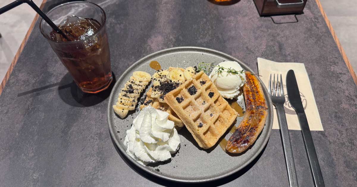 キャラメリゼバナナのワッフルとアイスティーを注文しました!