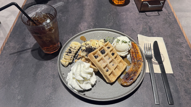 キャラメリゼバナナのワッフルとアイスティーを注文しました!