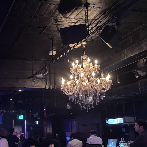 店内はワンフロアのみで、シャンデリアや大きなスクリーンがありました