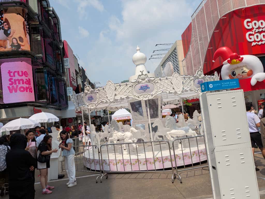 サイアムエリアでは大規模な特設ブースやフォトスポットが設置され、音楽イベントや限定ショップも登場していました。ショッピングモールの前にはメリーゴーラウンド風の装飾や可愛らしいゲートが並び、まるでテーマパークのような華やかさでした。多くの若者やカップルが写真を撮り、思い思いにイベントを楽しむ様子が印象的でした。