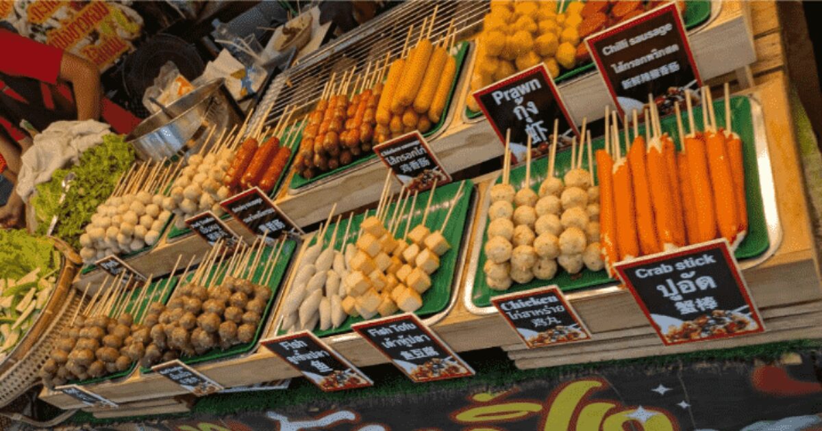 串に刺さったソーセージやつみれ、焼きとうもろこしなど、カラフルでバリエーション豊かなメニューが目白押し。好きなものを少しずつ選べるのも屋台ならではの楽しさです。