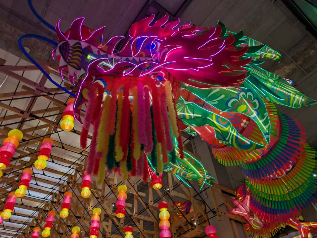 訪れた時期は春節シーズンでした。館内には大きな龍のモニュメントが設置され、赤と黄色を基調とした鮮やかな装飾が施されていました。天井から吊るされたランタンや華やかなオブジェが並び、モダンな空間に中国文化のエッセンスが融合していました。写真を撮る人の姿も多く、祝祭ムードに包まれていました。